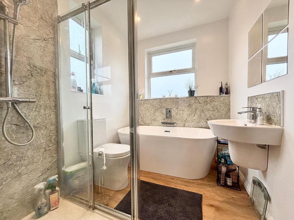 Obscure double glazed window to rear, obscure double glazed window to side, 4 piece suite comprising of separate walk in shower cubicle, low level WC, double ended bath with feature waterfall filler, wall hung wash hand basin with mixer tap, wood effect floor, extractor fan, spot lighting.