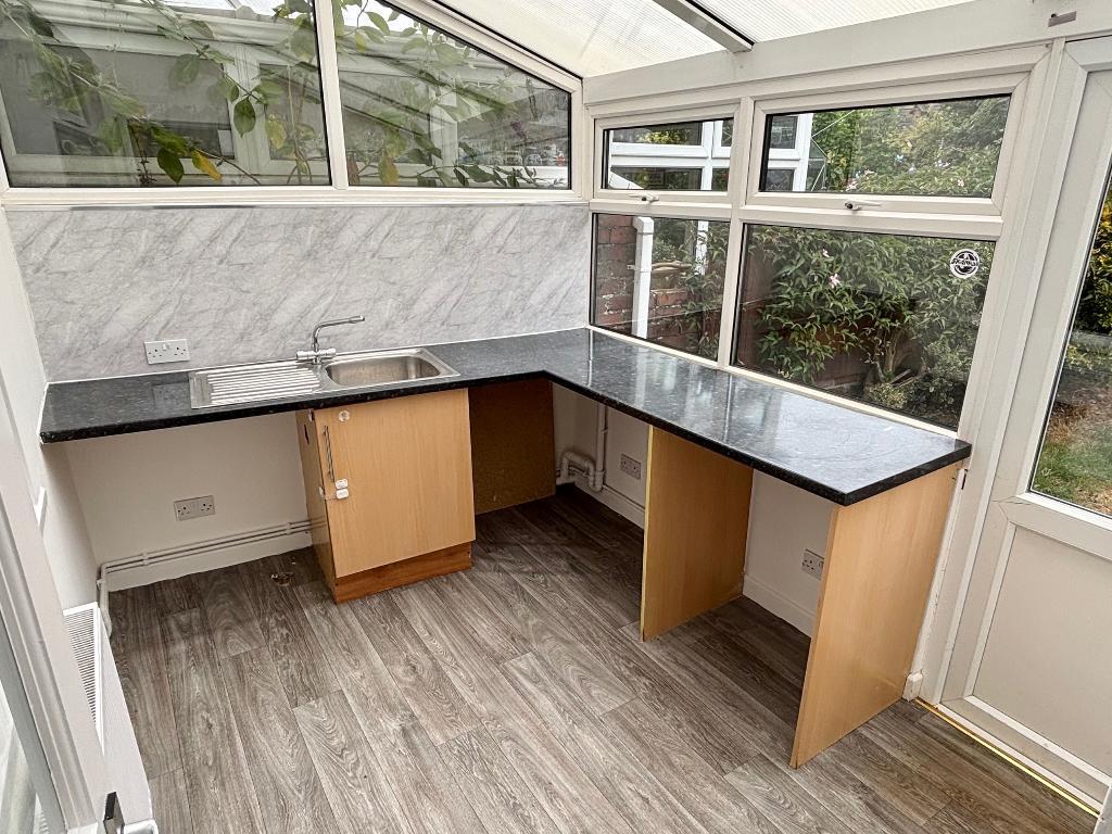 9' 6'' x 7' 8'' (2.9m x 2.35m) Radiator, doors to rear garden, base units, sink drainer unit, work top surfaces, space for appliances.