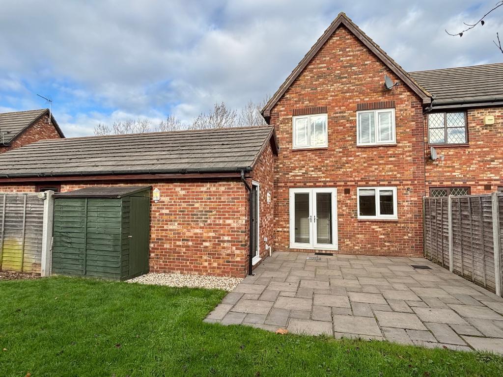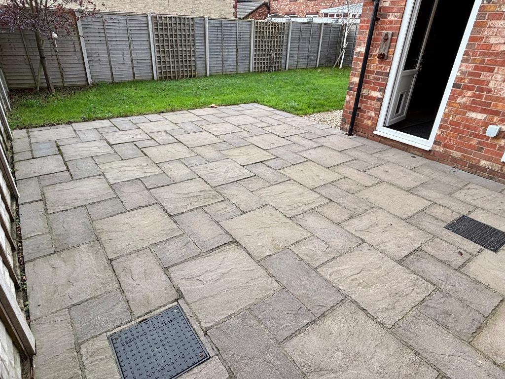 Southerly facing and enclosed by fencing, generous patio area leading to an extra wide lawn with inset trees & corner shrub border, garden shed, outside lighting, outside tap.