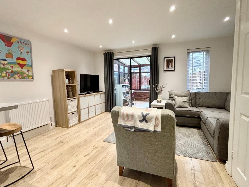 Double glazed window to rear, double glazed sliding doors to conservatory, matching wood effect floor, two radiators, cupboard under stairs for storage, breakfast bar between lounge and kitchen.